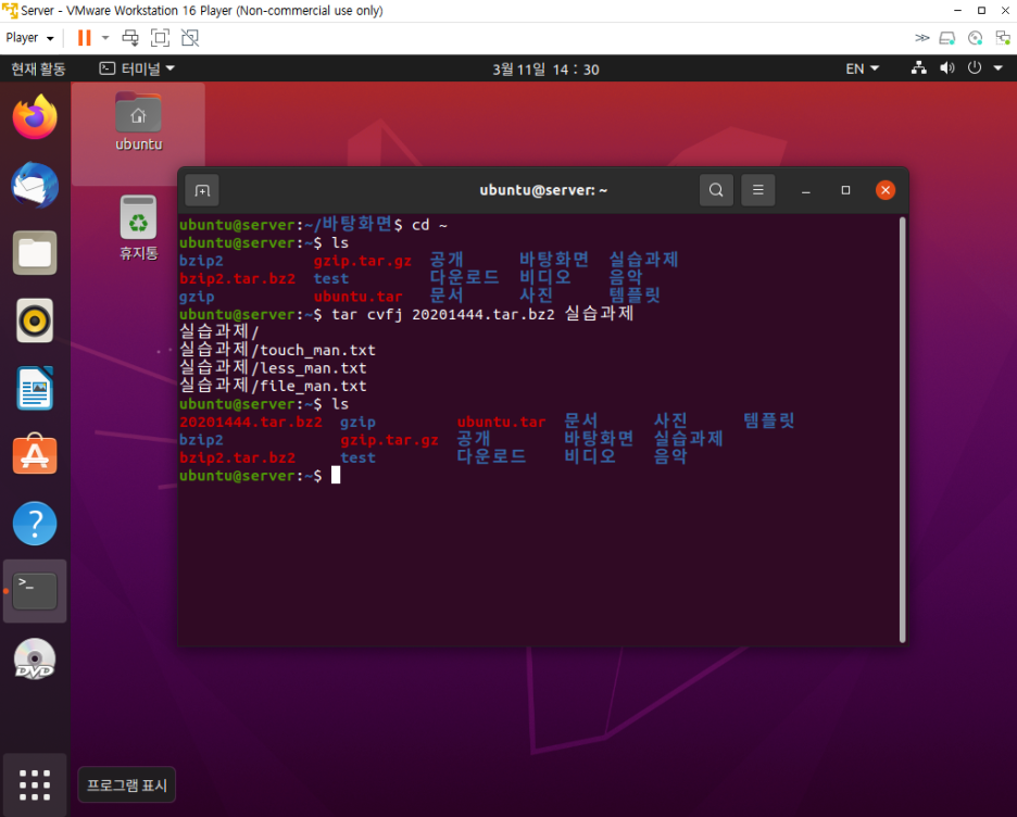 마지막으로 파일을 묶고 압축하는 실습을 해보았다. 파일을 묶고 압축하는 과정이 한꺼번에 진행되는 윈도우와 달리 리눅스는 두 개의 과정을 따로 본다고 한다. 여기서 주의해야 할 사항은