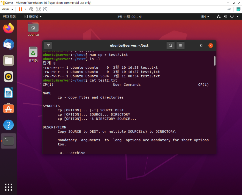 아래 사진은 명령어 cp의 man 내용을 test2.txt 파일로 저장한 뒤 명령어 cat을 사용하여 파일 내용을 확인한 것이다.
