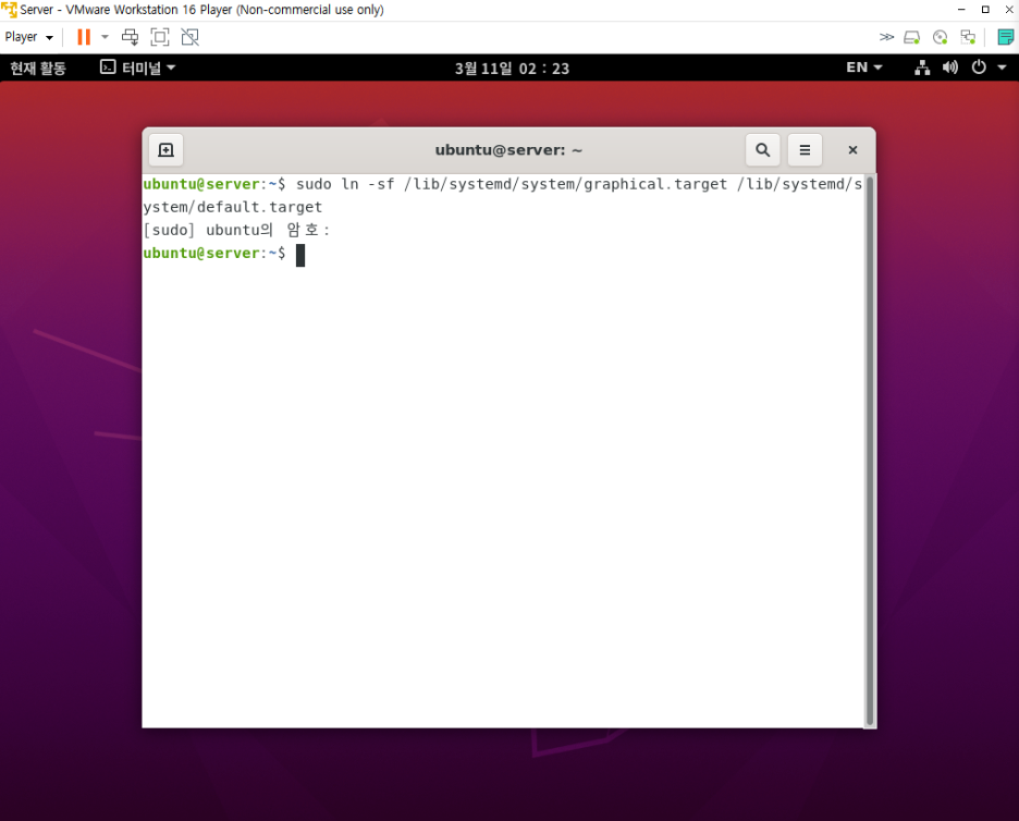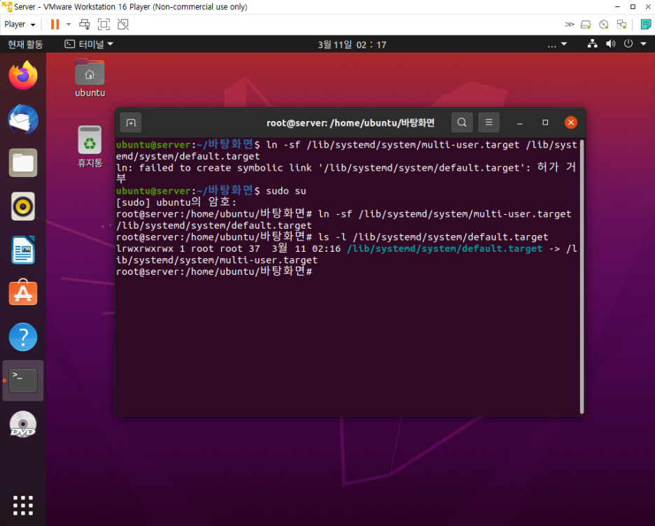 : (root 계정에서) ln -sf /lib/systemd/system/multi-user.target /lib/systemd/system/default.target