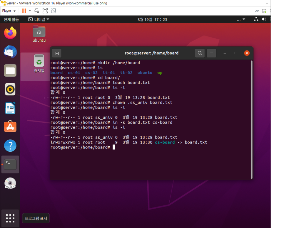 그리고 리눅스의 디렉터리 안에는 하드 링크와 소프트(심볼릭) 링크가 있다는 것과 그 둘의 차이점에 대해 학습하였다. 아래 사진은 board.txt 파일을 생성한 뒤 cs-board라는 심볼릭 링크 파일을 생성한 것이다.