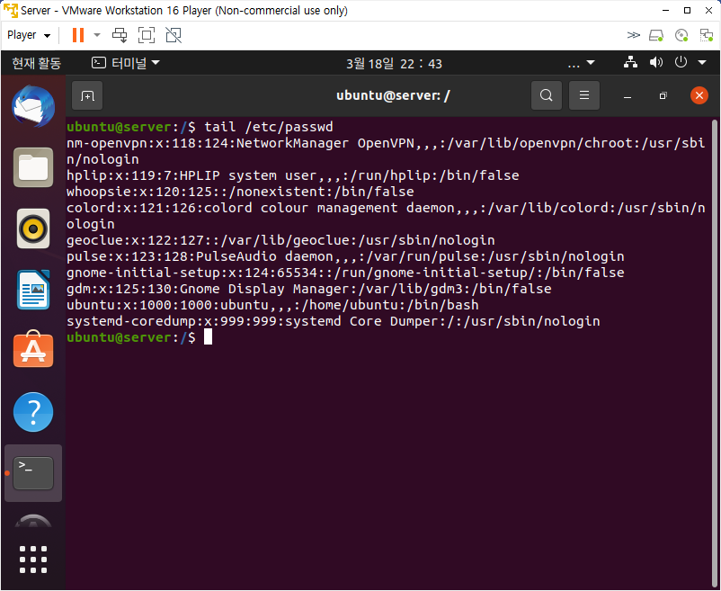 이번 수업 시간에는 리눅스의 디렉터리 구조에 대해 배우고 다중 사용자 관리 시스템인 리눅스에서 터미널을 통해 사용자 정보와 그룹 정보를 확인하는 법을 실습하였다. 아래 사진은 tail /etc/passwd 명령어를 통해 사용자 정보 중 아래 10줄만을 확인하는 모습이다.