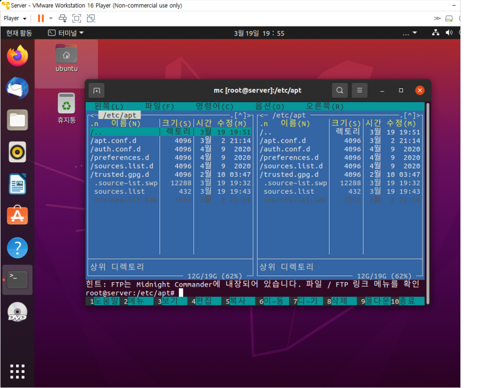 마지막으로 리눅스의 강점 중 하나라고 볼 수 있는 프로그램 설치에 대해서도 배워보았다. 리눅스는 프로그램을 설치할 때 온라인 저장소에서 패키지를 다운로드 한 뒤 의존성 문제를 파악하여 해당 프로그램이 필요로 하는 다른 프로그램들을 자동적으로 함께 설치해준다. 이때 apt라는 명령어를 사용하여 프로그램을 설치하게 된다. 아래 사진은 apt 명령어를 사용하여 파일 관리 시스템 미드나잇 커맨더(mc)를 설치하는 모습이다.