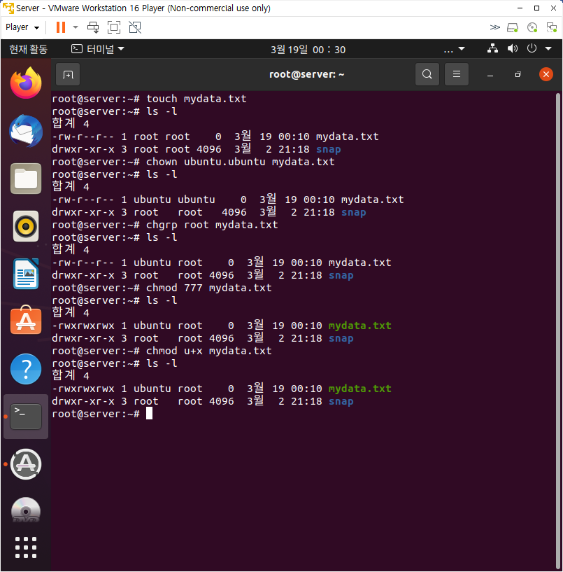 아래 사진은 mydata.txt 파일을 생성한 후 해당 파일의 소유자, 소유 그룹, 권한을 바꿔보는 모습이다.