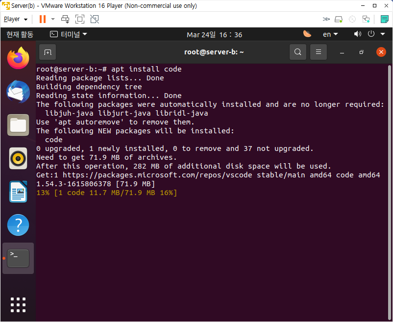 apt install code 를 입력해주면 설치가 시작된다.